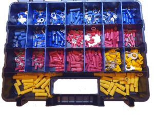 Heavy duty assortment box measuring 300mm x 230mm with 25 of each of the 23 fast moving terminal types. Top 9 red terminals, top 10 blue terminals and top 4 yellow terminals. 575 terminals in total. Each type held in stock so you can top up as you use them.