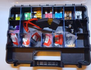 The “odd one” that catches you out !! Again a heavy duty assortment box measuring 300mm x 230mm . Inside we have 2 of each Maxi Blade fuse; 8 amperages from 20amp to 100amp. There is also a maxi blade fuse holder in this kit. We have 10 of each strip fuse; 8 amperages from 30amp to 100amp. There is also a strip fuse holder in this kit as well.