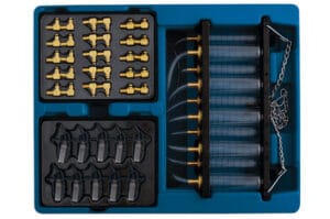 A return fuel volume tester (leak-off tester) for common rail (CR) and conventional diesel injectors. Designed to be connected to each of the injector fuel return (leak-off) connectors so that leak off volume of all injectors can be accurately measured at the same time. Laser Tools Part No. 5260 measures the return fuel flow on engines up to ten cylinders. Assists with the diagnosis of poor engine performance due to worn or blocked injectors. A faulty or partially blocked injector will send extra fuel back to the fuel tank; running the engine for just a few seconds with the tester fitted will show up a faulty injector by reading a higher level of fuel in the graduated fuel chambers. Very easy to fit, just pop off the return pipe connectors on the injectors and substitute with the fuel lines from the tester. This kit includes adaptors for Bosch, Siemens, Denso and Delphi common rail injectors. More adaptors available from the Connect Range.