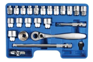 - 19 x 1/2″D sockets: 8, 9, 10, 11, 12, 13, 14, 15, 16, 17, 18, 19, 20, 21, 22, 24, 27, 30, 32mm; with 1/2″D or 21mm Hex Drive.