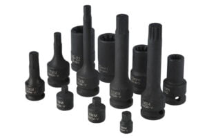 - 1/4”D impact hex socket bit: 9 x 20mm long; 3/8″D impact hex socket bits: 7 and 8mm x 24mm long, 9 x 52mm long; 1/2″D impact hex socket bits: 7 x 60mm long, 7 x 100mm long, 11 x 100mm long; 1/2″D impact Spline socket bit: M14 x 100mm (VAG rear caliper bolts).