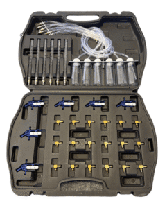 Measures return fuel flow on up to 6 cylinder diesel engines to detect injector issues. Includes tubes, bottles and a range of 24 connectors to cover Bosch, Siemens, Denso & Delphi injectors supplied in a sturdy case.