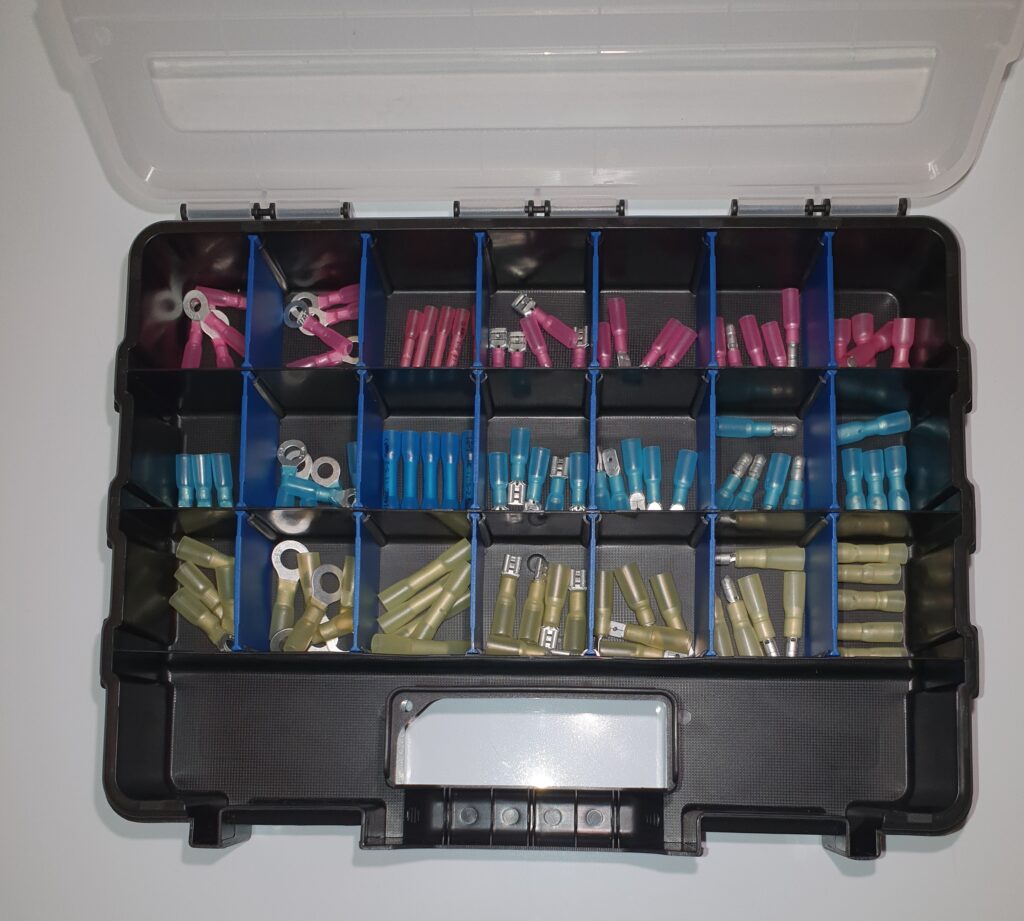 Heavy duty assortment box measuring 300mm x 230mm. Filled with the complete range of heat shrink, pre- insulated crimp terminals. 21 part numbers and 5 of each in the box. Individual types always in stock so you can top up the ones you use. Full range of red, blue and yellow terminals.