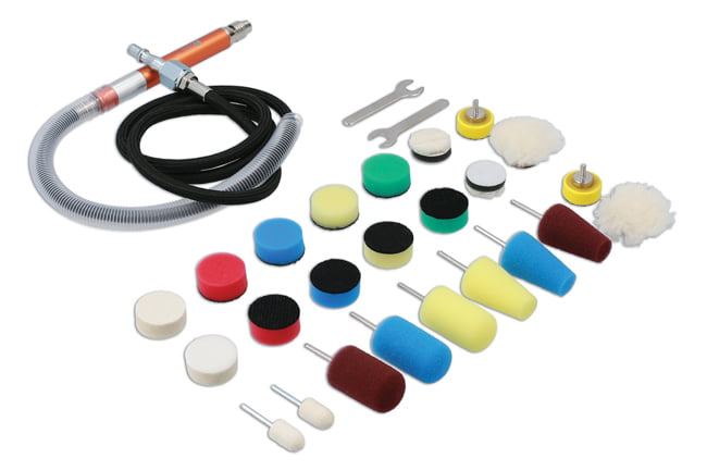A 29 piece, lightweight pneumatic detail polishing kit, for buffing & polishing intricate areas on any vehicle to achieve a rich, swirl free, high gloss finish.
